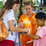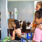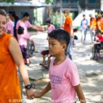 L’organisation de la journée est la même pour les deux groupes : petit déjeuner, activités, repas, sieste, puis d’autres activités. La différence, c’est qu’il faut aider les enfants handicapés physiques à se doucher, se nourrir, se brosser les dents….C’est le rôle des moniteurs qui, avec l’aide de Chetra, se répartissent les différents types d’aide à apporter. Il y a quatre ans, il n’était qu’un enfant de plus dans ce programme mais depuis l’année dernière, il est devenu un moniteur et une aide précieuse pour le reste des bénévoles et des accompagnateurs. Il connaît les particularités de chacun des enfants, et indique quels couverts utiliser avec chacun d’entre eux, quels aliments ils peuvent manger et ceux qu’ils ne peuvent pas manger….